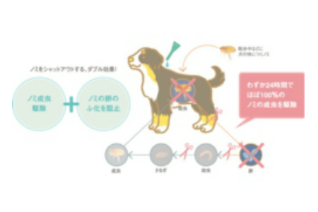 投与後24時間でノミの成虫駆除、ノミの卵のふ化防止・再寄生予防。マダニを48時間で駆除しその他の寄生虫にも効果を発揮します。